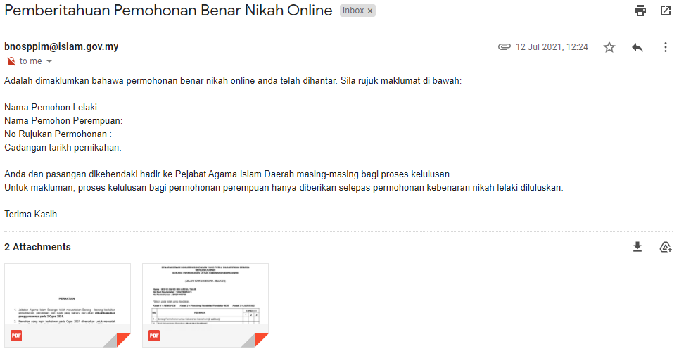 - SERAHKAN DOKUMEN ANDA BERSAMA SURAT KEBENARAN KAHWIN PIHAK LELAKI DI PAID/JAWI DI TEMPAT ANDA
